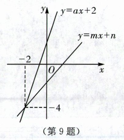 9. 如图,已知一次函数$y= ax+2与y= mx+n图象的交点坐标为(-2,-4)$.现有下列四个结论:①$a>0$;②$mn>0$;③方程$ax+2= mx+n的解是x= -2$;④若$mx+n<ax+2<0$,则$-2<x<-\frac {2}{3}$.其中正确的结论个数是(