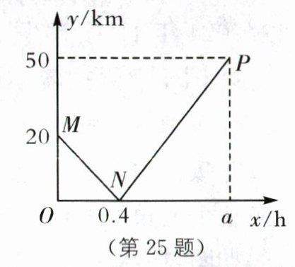 (3)设线段MN所表示的函数关系式为y=k₁x + b₁(k₁,b₁为常数,且k₁≠0)。将点M(0,20)和点N(0.4,0)分别代入y=k₁x + b₁,得{b₁=20,0.4k₁ + b₁=0},解得{k₁=-50,b₁=20},