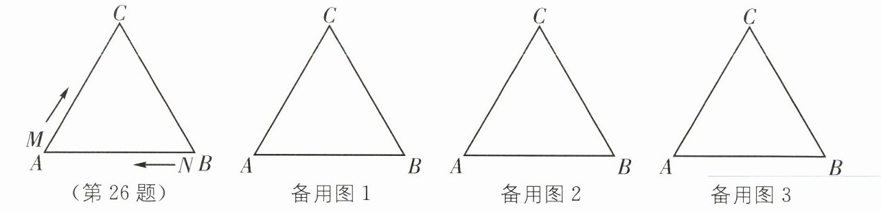 26. (14分)中考新考法 动点问题 如图,在等边三角形ABC中,AB= AC= BC= 6 cm.现有两点M,N分别从点A,B同时出发,沿三角形的边运动,已知点M的速度为1 cm/s,点N的速度为2 cm/s.当点N第一次回到点B时,点M,N同时停止运动,设运动时间为t s.