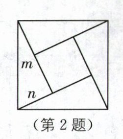 2. 传统文化 赵爽弦图 (2024·南通中考)"赵爽弦图"巧妙利用面积关系证明了勾股定理.如图所示的"赵爽弦图"是由四个全等直角三角形和中间的小正方形拼成的一个大正方形.设直角三角形的两条直角边长分别为m,n(m>n).若小正方形面积为5,$(m+n)^2= 21$,则大正方形面积为(