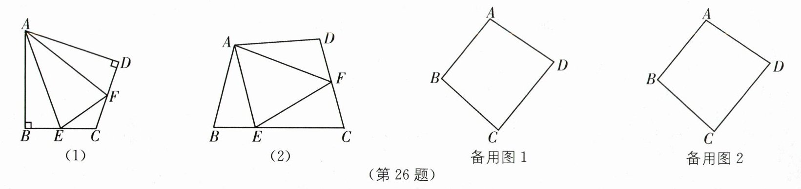 26.(14分)中考新考法 类比猜想 (1)如图(1),在四边形 ABCD 中,$AB= AD$,$\angle B= \angle D= 90^{\circ}$,E,F 分别是边 BC,CD 上的点,且$\angle EAF= \frac{1}{2}\angle BAD$.请直接写出线段 EF,BE,FD 之间的数量关系:______.