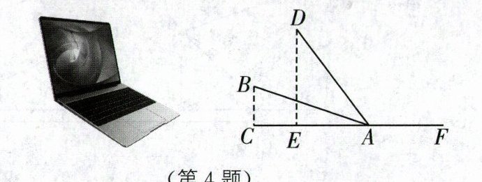 4.新情境 探究笔记本电脑张角大小(2024·苏州工业园区八校联考)某数学兴趣小组开展了笔记本电脑的张角大小的实践探究活动.如图,当张角为$\angle BAF$时,顶部边缘B处离桌面的高度BC为7 cm,此时底部边缘A处与C处间的距离AC为24 cm,小组成员调整张角的大小继续探究,最后发现当张角为$\angle DAF$时(点D是点B的对应点),顶部边缘D处到桌面的距离DE为20 cm,则底部边缘A处与E之间的距离AE为(