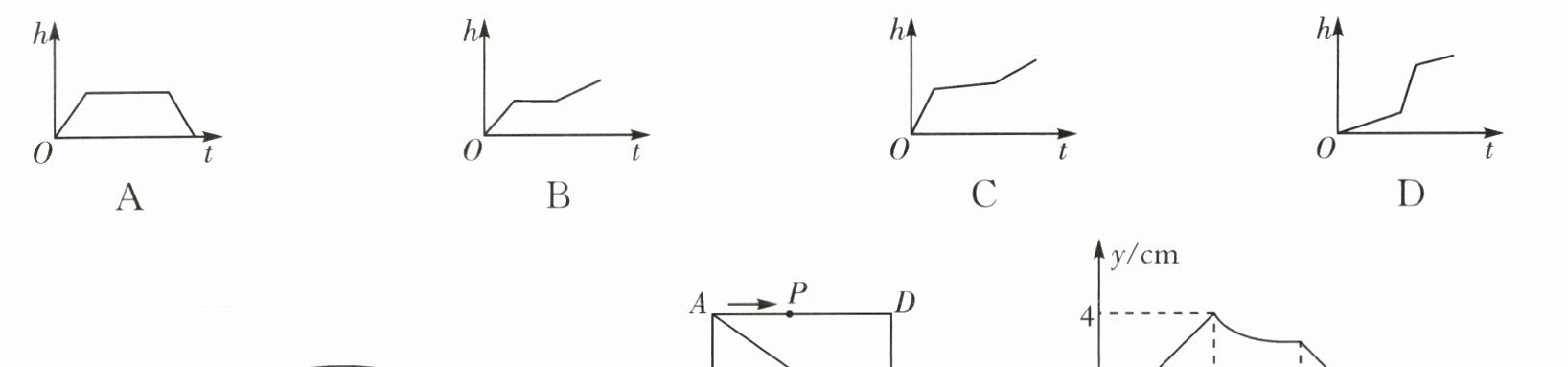 解:容器由下到上依次为圆柱、较粗圆柱、圆柱,底面积从小到大再变大。匀速注水时,底面积越小,水面高度h随时间t上升越快,即图象斜率越大。因此,h-t图象斜率先小后大再小,对应选项D。
