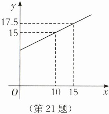 (1)设一次函数表达式为$y = kx + b$,由图可知函数图像过点$(10,15)$和$(15,17.5)$,代入得$\begin{cases}10k + b = 15 \\15k + b = 17.5\end{cases}$,解得$\begin{cases}k = 0.5 \\b = 10\end{cases}$,所以一次函数表达式为$y = 0.5x + 10$。