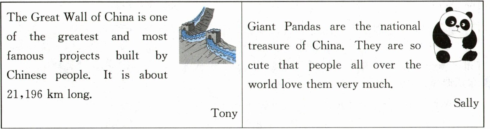 | The Great Wall of China is one of the greatest and most famous projects built by Chinese people. It is about 21,196 km long. | | Giant Pandas are the national treasure of China. They are so cute that people all over the world love them very much. | |