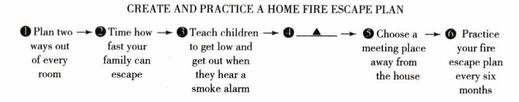 3. C [解析]细节理解题。根据“A good plan should start with two escape ways from every room. Then know how fast your family can run,tell kids when and how to get out,and make a house map with all doors and windows. At last,choose a meeting place outside. And don't forget to practice it often with every family member.”可知,一个好的计划应该从明确每个房间的两条逃生路线开始;然后了解你家人的逃生速度,告诉孩子们何时以及如何逃生,并绘制一张标有所有门窗的房屋地图;最后,在室外选择一个集合点,并且不要忘记经常和每个家庭成员演练。所以第四步是绘制一张包含所有门窗的房屋地图。故选 C。