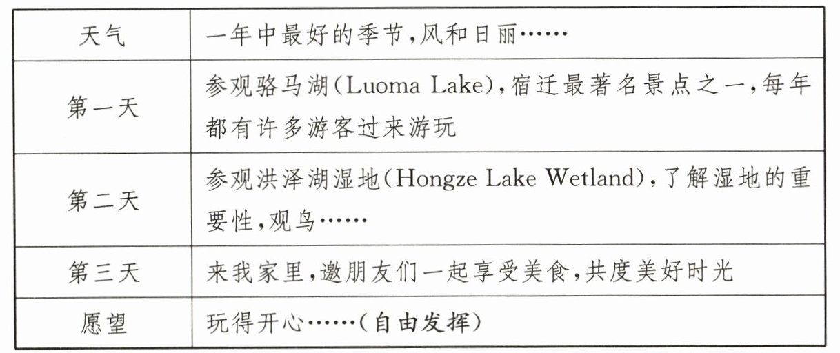 On the first day,we can visit Luoma Lake,one of the most famous attractions in Suqian. Many tourists come here every year. On the second day,we will go to Hongze Lake Wetland to learn about its importance and watch birds. On the third day,you can come to my house. I will invite friends to enjoy delicious food and have a great time together.