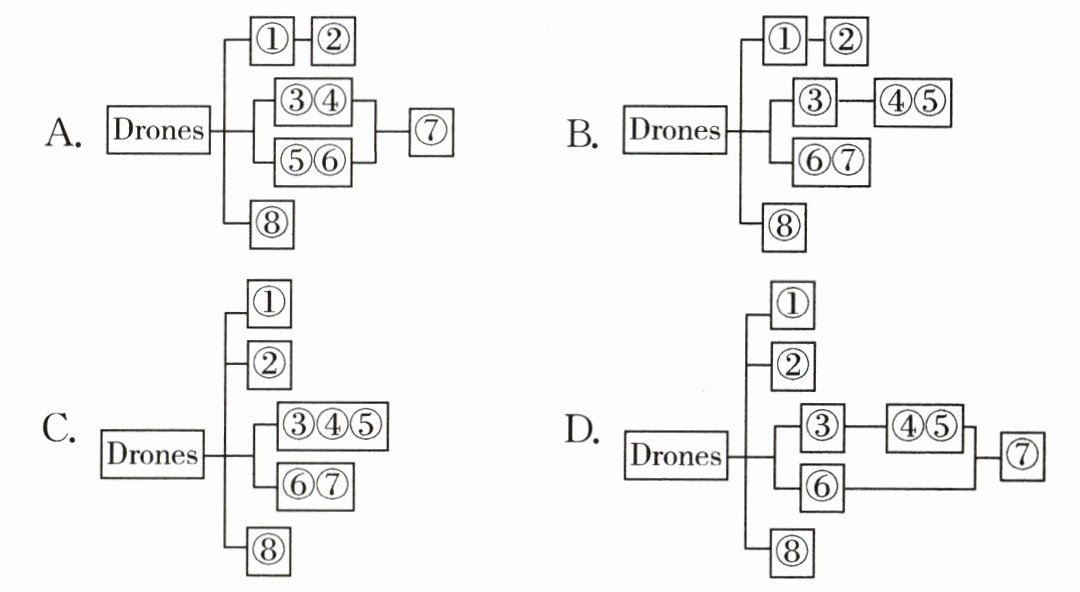 3. D [解析]篇章结构题。第一段引出无人机话题;第二段介绍无人机的可操控性;第三段介绍无人机可以快速高效地完成困难及特殊任务;第四段和第五段举例说明无人机的应用,与第三段构成总分关系;第六段介绍无人机可以为公众提供便利,与第三段并列;第七段是对无人机作用的总结;第八段介绍了无人机的优势及其发展前景。因此 D 选项符合本文的结构。故选 D。