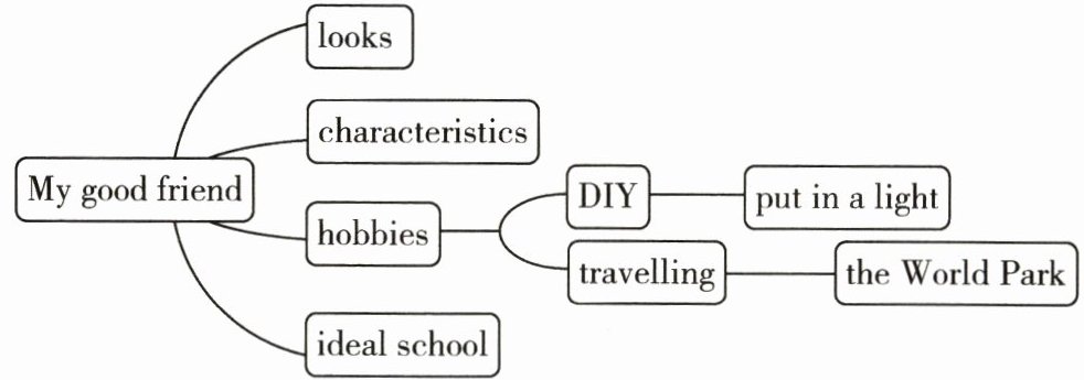 One possible version: My good friend is Simon. He looks tall and strong. When I am with him, I will never feel bored because he is a humorous boy. He likes doing DIY and travelling. Once, he put in a light in his bedroom successfully. Last week he went to the World Park and had a good time with his classmates. There were so many places around the world in the park. He once told me that his ideal school must have many interesting subjects, such as Computer Science, PE and AI courses. I like studying and playing with my good friend. Can you tell me something about your good friend? 思路引导 [总体分析] ①题材:本文是一篇材料作文。②时态:一般现在时和一般过去时。③提示:写作要点已给出,注意不要遗漏提示中的要点,适当添加细节,并突出写作重点。 [写作步骤] 第一步,介绍自己好朋友的名字、外貌和性格;第二步,具体阐述自己好朋友的兴趣爱好和理想的学校;第三步,书写结语。 [亮点词汇] ①feel bored 感到无聊 ②like doing sth 喜欢做某事 ③have a good time 玩得开心 ④such as 例如 [高分句型] ①When I am with him, I will never feel bored because he is a humorous boy. (when 引导时间状语从句;because 引导原因状语从句) ② He once told me that his ideal school must have many interesting subjects, such as Computer Science, PE and AI courses. (that 引导宾语从句)
