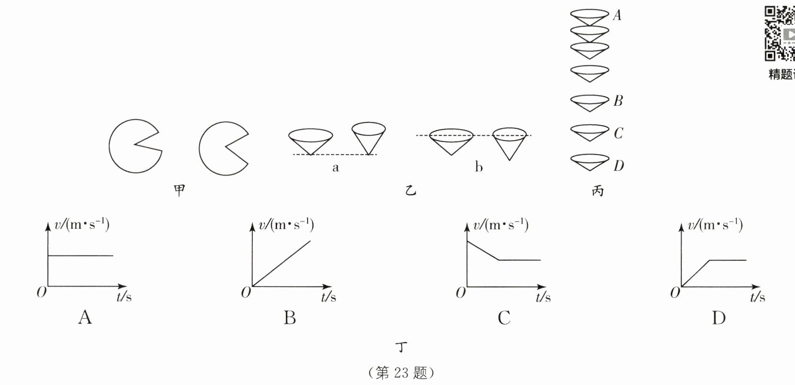 23.(5分)为比较纸锥下落快慢,小明和同学们用两个相同的纸片分别裁去一个扇形(如图甲所示),做成图乙所示的两个锥角不等的纸锥.