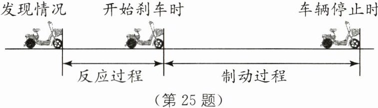 25.(15分)(2025·扬州宝应县期末)根据中国现行的交通安全法规,骑行时使用手机属明确的违法行为.某青年一边看手机一边骑着电动车,结果发生了剐蹭.电动车紧急停车要经历如图乙所示的反应和制动两个过程,当电动车以18 km/h的速度匀速行驶时,他看一眼手机需要2.5 s,在这段时间内相当于在无人驾驶状态下以原来速度匀速行驶.该人发现情况紧急停车时,在反应时间内电动车行驶了4 m,制动过程所用时间为3 s,电动车在这两个过程中行驶的总距离为9.9 m.求: