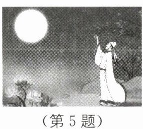 B [解析]月亮是反射的太阳的光,月亮不是光源,故A错误;光射到不透明物体上,在不透明物体后面形成影子,月光下李白的"孤影"是由于光沿直线传播形成的,故B正确;酒杯中的酒面相当于平面镜,酒杯中的"明月"即月亮的倒影是光的反射形成的虚像,故C错误;人的眼睛相当于照相机,"明月"在人眼的视网膜上成倒立、缩小的实像,故D错误.