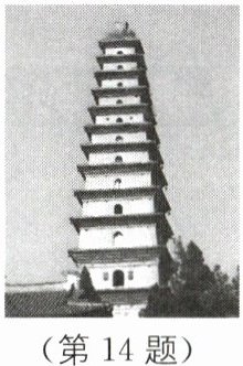 14. 莺莺塔(如图所示)在山西省永济市普救寺内,全塔共13层,高36.76 m。在塔的附近敲击石块,人们在一定位置便可听到“咯哇、咯哇”类似青蛙的鸣叫,经多方面研究,莺莺塔回音机制主要有两个方面:①建筑材料表面光滑还涂有釉料,对声波具有良好的反射作用。②它的塔檐非常特殊,每层檐都有一个向内弯曲的弧度,入射到每层檐的声波都被全部反射后,声音再经过叠加、汇聚,最后使回音增强,并且这种叠加有时能使声音拖长、频率发生变化,使敲击石块的声音变成蛙鸣。根据上述材料,请你回答: