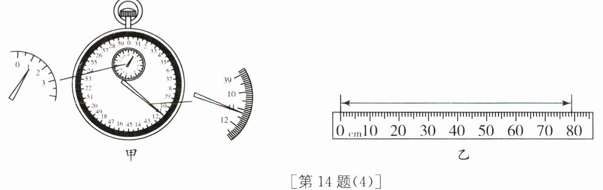 (4)机械秒表大表盘的分度值是0.1s,小表盘的分度值是0.5min,分针在1与2之间且未超过半刻度线,所以分针示数是1min,秒针示数是11.2s,则读数是1min11.2s,即71.2s.图乙中刻度尺最小一格表示的长度为1cm,所以刻度尺的分度值是1cm,由图可知轮子的周长为79.0cm.