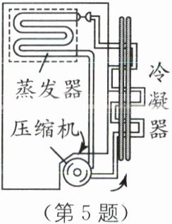 C[解析]液态的制冷剂通过电冰箱冷冻室,由液态变为气态是汽化过程,汽化过程中吸收热量,把冰箱冷冻室内的热量带走;气态制冷剂进入冷凝器,气态的制冷剂变为液态的制冷剂,是液化过程,液化放出热量,温度降低,把冰箱内的热量散失掉,所以制冷剂需选用既容易汽化又容易液化,且汽化吸热能力强的物质,故A、B错误,C正确;电冰箱制冷机工作后,冰箱冷冻室内的蒸发器温度降低,吸收空气中的热量,而与此同时,冰箱外部的冷凝器温度升高,将热量传给空气,室内空气的热量被冰箱吸收后又被放出,所以室温不会下降,故D错误。
