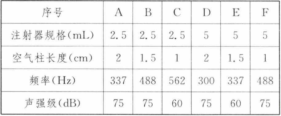 小华找来了两个未使用过的一次性注射器制成了哨子.注射器的规格分别为 2.5 mL 和5 mL.他一边吹哨子一边调整注射器内空气柱的长度,同时利用专用仪器测出声音的频率和响度,详见表(表中“mL”表示毫升,“cm”表示厘米).