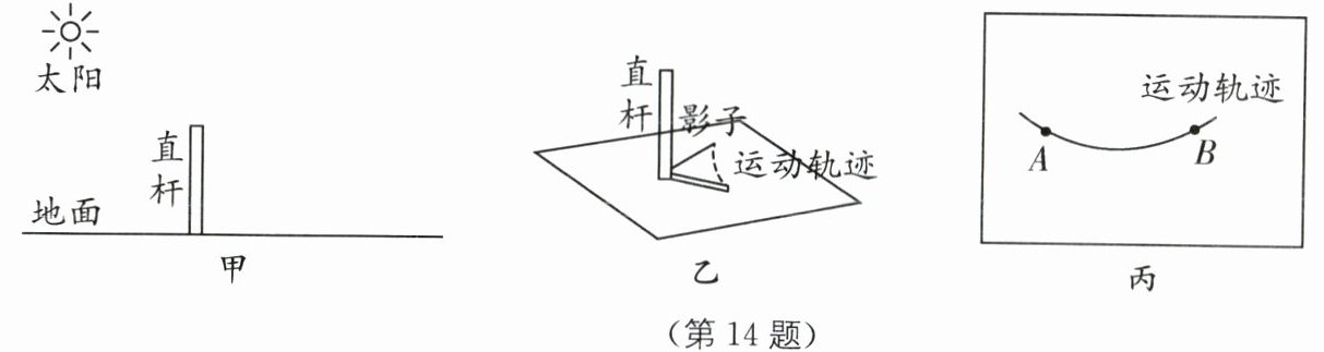 ①如图丙所示,已知运动轨迹上A、B两点直杆影长相等,请运用几何作图的方法确定正北方向,并用箭头表示出来;