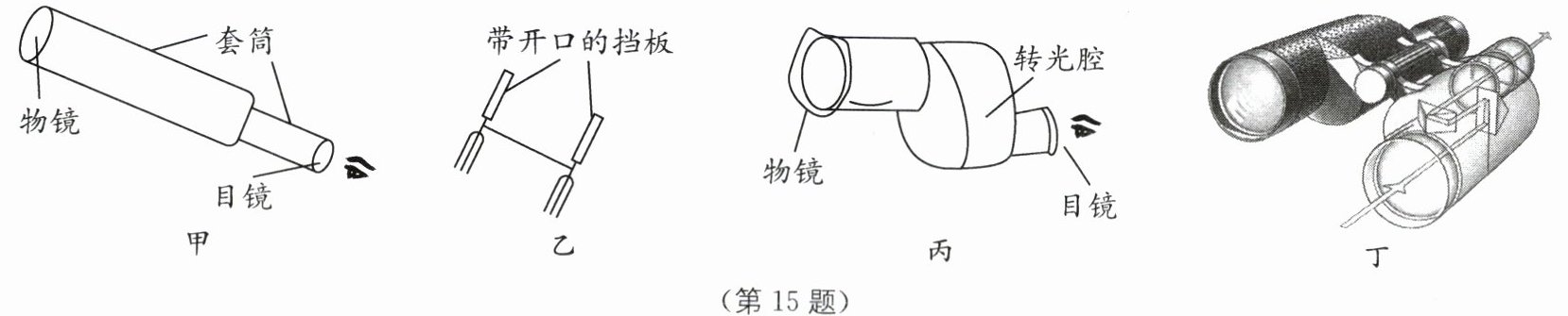 .(3)小明用此自制望远镜看远处物体时,发现像与物相比较上下、左右都颠倒了,为使看到的像与物相比不失真,老师建议他将望远镜设计成物镜与目镜不共轴、中部为空腔的形状(如图丙所示),再利用几片小平面镜,安装到中部空腔内以改变光路,可以满足要求。结合课本的插图可知(如图丁所示),小明要想达到此效果,至少需要