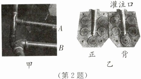 是热水管.(2)中国铸币发展史源远流长,如图乙所示,“钱范”是古代铸造钱币所用的模具,由正、背两块组成,内部均刻有图文.铸币时,合上正、背两块,将液态金属灌入其内,待液态金属凝固后取出,即可得到金属钱币.下表提供两种材料在1个标准大气压下的熔点,请回答: