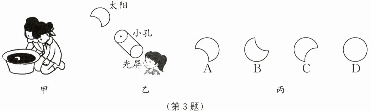 m.(提示:物与像的大小之比等于物距与像距之比)(5)日食开始后,小丽观察到如图乙所示的太阳,她在光屏上观察到的像是图丙中的