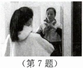 7.A [解析]小华把手指压在玻璃镜面上,手指与像相距 6mm,说明手指与镜面反射面距离为 3mm,则镜面厚 3mm,A 错误,符合题意;小华向着镜面以 1m/s 的速度移动 1s 后,小华距平面镜 1m,像距她 2m,B 正确,不符合题意;晚间照镜子时,用手电筒对准镜中的像照射,光线反射到脸上,像更清晰,C 正确,不符合题意;平面镜成像与成像物体大小相等,如果平面镜打碎成两半,小华在平面镜中仍能成完整的像,D 正确,不符合题意。