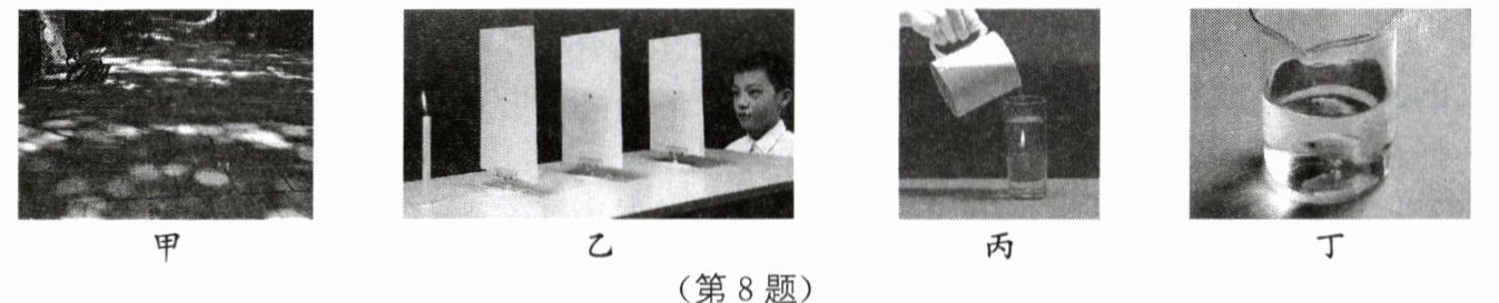 8.D [解析]树荫下亮斑是太阳通过小孔成的倒立的实像,形状和树叶缝隙的形状无关,A 错误;通过三个小孔看到的是光沿直线传播的烛焰,B 错误;实验中使用了一块玻璃板,将点燃的蜡烛放在玻璃板的一侧,然后在玻璃板的另一侧放置一根未点燃的相同蜡烛。通过调整未点燃蜡烛的位置,使其与点燃蜡烛在玻璃板后的像重合。当从玻璃板的一侧观察时,会看到似乎有一根蜡烛被浇上了水,但实际上水是倒在了未点燃的蜡烛上。由于平面镜成像的特性,观察者会误以为浇在未点燃蜡烛上的水也浇在了点燃的蜡烛上,从而产生蜡烛“浇不灭”的错觉,故“浇不灭的蜡烛”是光的反射形成的虚像,C 错误;人眼看到的 3 条完整的“小鱼”,一个是光的折射形成的虚像,一个是凸透镜成正立、放大的虚像,另一个是经光的反射、折射后形成的虚像,D 正确。