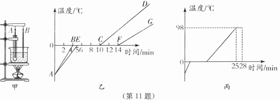 11. 在探究"冰的熔化特点"的实验中,分别在烧杯和试管中放入适量的碎冰,并各放了一支温度计,如图甲所示,实验过程中根据两个温度计的示数随时间变化分别作出 ABCD 和 AEFG 两个图像,如图乙所示,继续加热探究"水沸腾的温度变化特点",整个过程烧杯中水的温度一时间图像如图丙所示,下列说法正确的是(