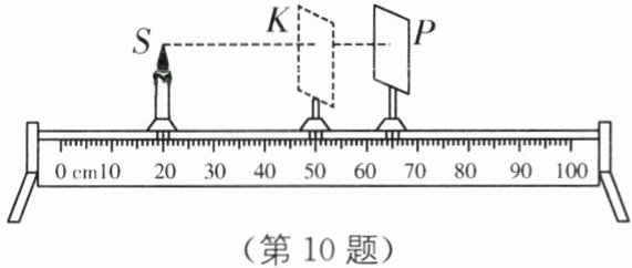 10. 蜡烛 S、某光学元件 K 和光屏 P 按如图所示位置放置在光具座上,它们的中心在同一水平直线.此时光屏上可观察到烛焰清晰的像,则下列说法中正确的是(