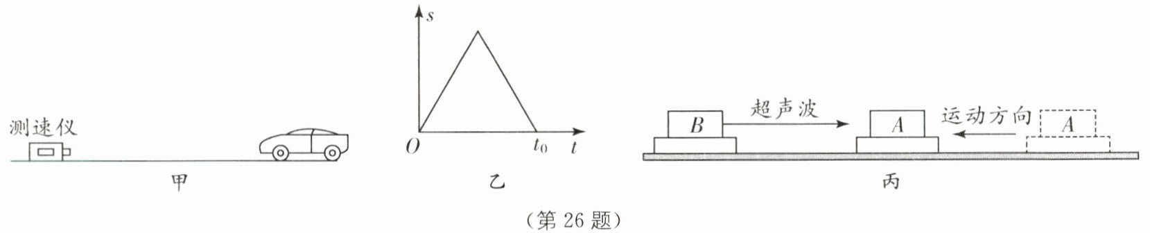 26. (11 分)跨学科 数形结合 (2024·盐城月考)测距是测速的基础,如图甲所示,超声波测速仪向静止的汽车发射超声波信号(简称信号),同时开始计时,信号传播过程中遇到汽车会被反射,测速仪接收到返回的信号就停止计时,根据记录的时间及其与路程、速度的关系,可计算出汽车与测速仪之间的距离,图乙是信号传播过程的 s-t 图像,s 表示信号与测速仪之间的距离,t 表示信号传播的时间.(超声波在空气中传播的速度为 340 m/s)