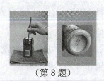 8. 如图所示,将冰块放于易拉罐中并加入适量的盐,用筷子搅拌大约半分钟,用温度计测量罐中冰与盐水混合物的温度,可以看到冰水混合物的温度低于$0^{\circ}C$.这时观察易拉罐的下部和底部,就会发现白霜.下列说法正确的是(