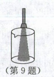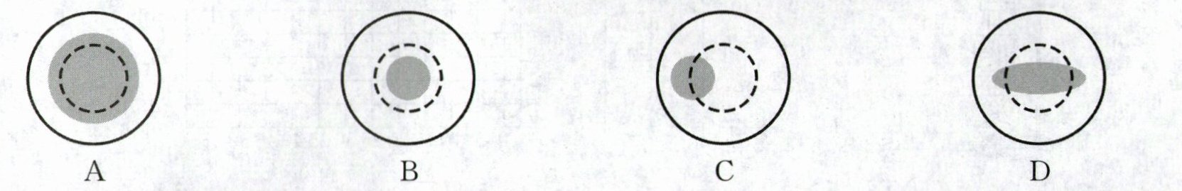 9. 手电筒发出的光竖直向下照射到一个空烧杯底部,光线投射到烧杯底部形成一个圆形光斑(如选项图中虚线所示),若再向烧杯中注水到一定高度时,烧杯底部的光圈会变为选项图中的(