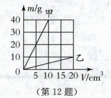 12. 由不同材料制成的甲、乙两实心物体,它们的质量与体积的关系如图所示,下列说法正确的是(