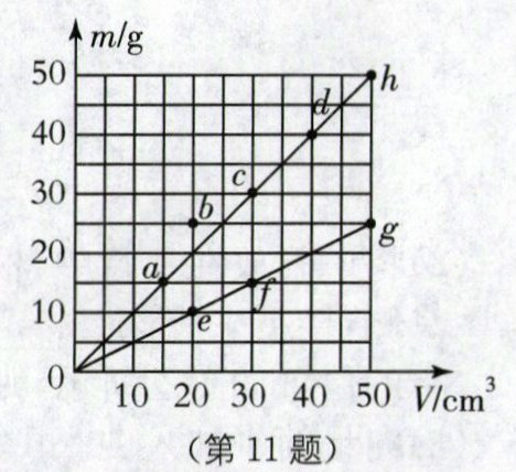11. C [解析]物体 a、c、d、h 质量和体积对应点在同过原点直线上,密度相等,且 $ \rho_a=\rho_c=\rho_d=\rho_h=\frac{m_a}{V_a}=\frac{m_c}{V_c}=\frac{m_d}{V_d}=\frac{m_h}{V_h}=\frac{15\ g}{15\ cm^3}=\frac{30\ g}{30\ cm^3}=\frac{40\ g}{40\ cm^3}=\frac{50\ g}{50\ cm^3}=1\ g/cm^3 $,D 正确,不符合题意;b 物体密度 $ \rho_b=\frac{m_b}{V_b}=\frac{25\ g}{20\ cm^3}=1.25\ g/cm^3 $;物体 e、f、g 质量和体积对应点在同过原点直线上,密度相等,且 $ \rho_e=\rho_f=\rho_g=\frac{m_e}{V_e}=\frac{m_f}{V_f}=\frac{m_g}{V_g}=\frac{10\ g}{20\ cm^3}=\frac{15\ g}{30\ cm^3}=\frac{25\ g}{50\ cm^3}=0.5\ g/cm^3=0.5×10^3\ kg/m^3 $,A、B 正确,不符合题意;C 错误,符合题意.关键提醒 关于坐标图像,应先分清横、纵坐标所表示的物理量及单位,平行于横坐标的直线表示纵坐标所表示的物理量不随横坐标物理量变化而变化;过原点的直线表示两个物理量存在正比例关系.