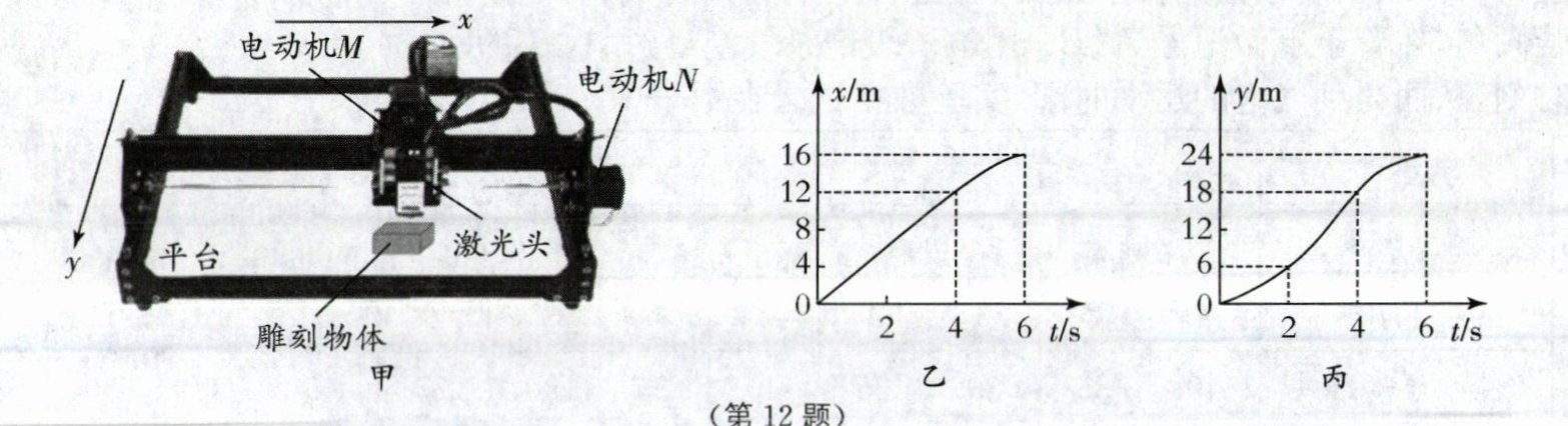 12. 如图甲所示是一台激光雕刻机,激光头的初始位置在平台的左上角,启动电动机M和N,激光头分别沿x和y方向移动,运动的路程一时间图像分别如图乙、丙所示.关于激光头的运动情况,下列说法正确的是(