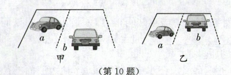 10. A [解析]图甲中,b 车在 a 车前,图乙中 b 车在 a 车后,则 a 车速度大于 b 车速度;b 车相对于 a 车向后运动,以 a 为参照物,b 向后运动,A 正确,C 错误;图乙中,b 车与 c 车相对图甲距离变大,故 b 车速度小于 c 车速度,B 错误;图乙中,a 车与 c 车相对图甲距离变大,故 a 车速度小于 c 车速度,以 c 为参照物,a 向后运动,D 错误.