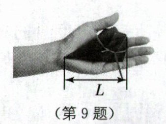9. D [解析]人的手掌长度约 10 cm,由图可知,粽子长度略大于手掌长度,约为 12 cm,即 120 mm,A 错误;蒸熟的粽子相当于赤豆与米被水浸透,可沉入水底,密度略大于水,约 1.2 g/cm³,一个粽子质量略大于两个鸡蛋总质量,约 120 g,粽子体积 $ V=\frac{m}{\rho}=\frac{120\ g}{1.2\ g/cm^3}=100\ cm^3=0.1\ dm^3 $,故 B、C 错误,D 正确.思路引导 解答估测题应先对题目中涉及的物理量有个初步的了解,对于选项中的单位,可根据需要进行相应的换算或转换,换算成较为熟悉的单位,排除与生活实际相差较远的选项,找出符合生活实际的答案.