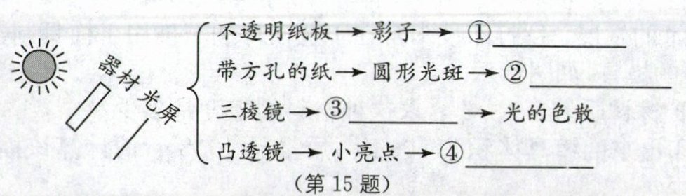 15. ①光的直线传播 ②光的直线传播(小孔成像) ③彩色光带 ④光的折射(凸透镜对光的会聚作用)[解析]本题考查光的直线传播、光的折射、凸透镜对光的会聚作用.不透明纸板后的影子是光沿直线传播过程中,不透明的纸板阻挡了光的传播,在纸板后形成的没有光线的阴影区域;带方孔的纸后形成的圆形光斑是太阳通过小孔形成的倒立的实像,是光沿直线传播形成的;太阳光通过三棱镜发生色散现象,实质是太阳光经过三棱镜发生折射;太阳光经过凸透镜能形成小亮斑点是因为凸透镜对光线具有会聚作用,将近似平行光的太阳光会聚到焦点上.