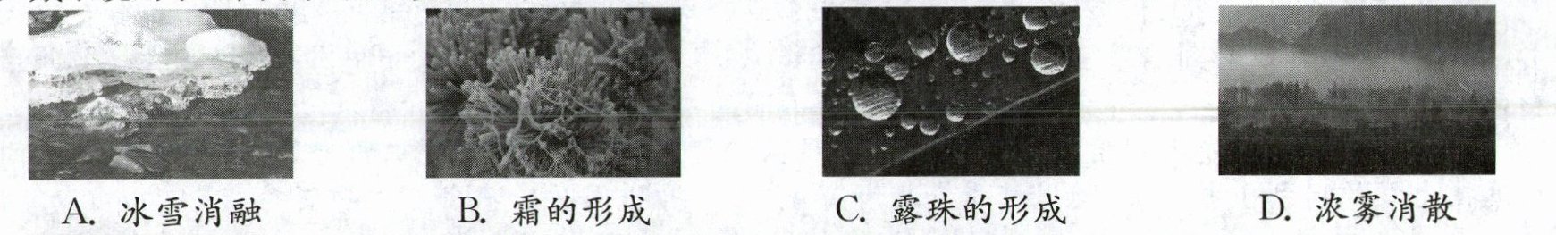 C [解析]戴眼镜的小丽同学的眼镜起“雾”,“雾”是周围空气中的水蒸气在眼镜上液化形成的小水滴.冰雪消融是物质由固态变成液态的过程,属于熔化,故A不符合题意;霜是由水蒸气凝华形成的小冰晶,故B不符合题意;露珠是空气中的水蒸气液化形成的小水珠,故C符合题意;浓雾消散是物质由液态变成气态的过程,属于汽化现象,故D不符合题意.