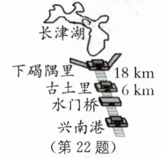 22. (6分)长津湖战役,是朝鲜战争的拐点.若美军从下碣隅里经过18 km到达古土里,再通过6 km外的水门桥就可到达兴南港逃脱中国人民志愿军的包围.由于中国人民志愿军顽强追击,美军撤退速度缓慢.(假设下碣隅里、古土里、水门桥大约在如图所示的直线上,美军撤退速度不变,为0.5 km/h)