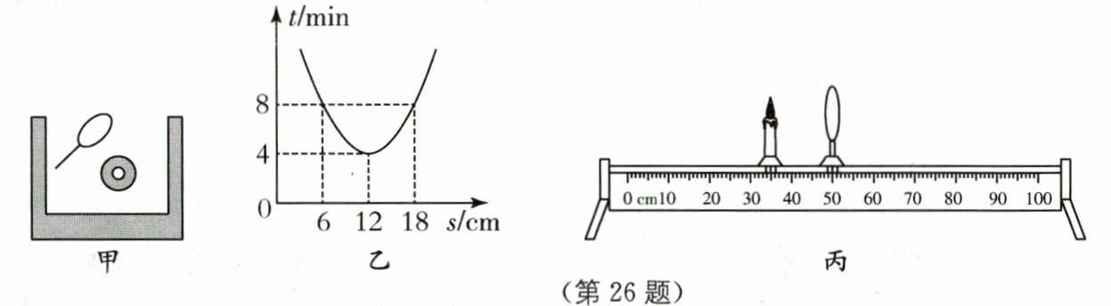 (1)由图乙可知,当s = 12 cm时白纸被烤焦的时间最短,因此可知当s = 12 cm时会聚的太阳光最强,由此可以判断焦点到凸透镜的距离为f = 12 cm.