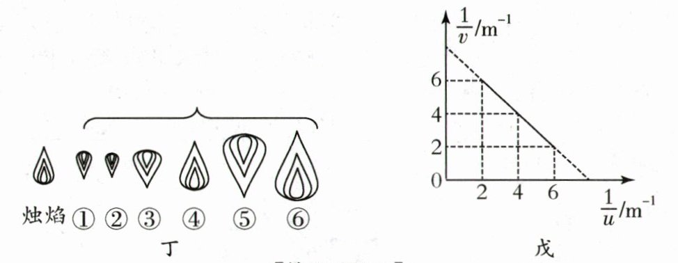 (7)由图戊可知,当$\frac{1}{u}=4\ m^{-1}$时,$\frac{1}{v}=4\ m^{-1}$,说明此时的像距等于物距,此时物体经凸透镜成倒立的、等大的实像,且u = 2f,此时的物距为$u = \frac{1}{4}\ m=0.25\ m=25\ cm$,则焦距为$f = \frac{1}{2}u=\frac{1}{2}×25\ cm=12.5\ cm$.知识拓展 凸透镜成实像与凸透镜成虚像时的动态规律不同,凸透镜成实像的动态变化规律是“物近、像远、像变大,物远、像近、像变小”,凸透镜成虚像时的动态变化规律是“物近像近像变小,物远、像远、像变大”.