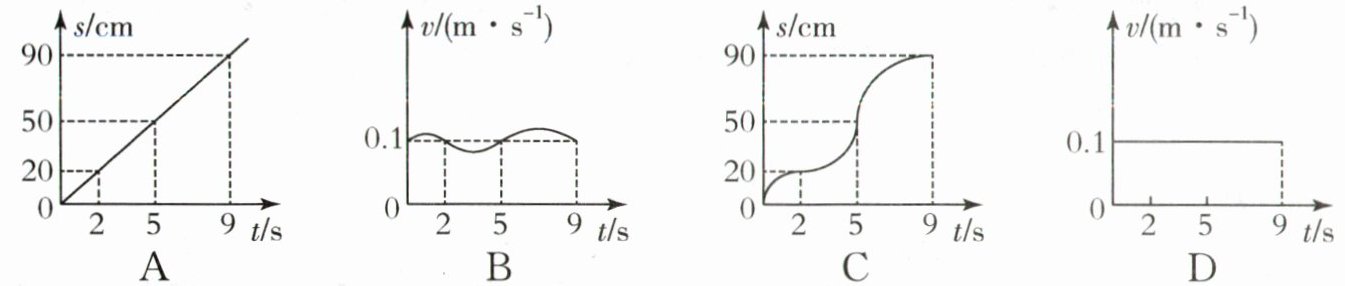 (4)由题意可知,电动玩具车在第2 s末到第5 s末的平均速度$v_1 = \frac{s_1}{t_1}=\frac{30\ cm}{5\ s-2\ s} = 10\ cm/s$,在第5 s末到第9 s末的平均速度$v_2 = \frac{s_2}{t_2}=\frac{40\ cm}{9\ s-5\ s} = 10\ cm/s$,因此可知,电动玩具车在这两段时间内的平均速度相等,均等于10 cm/s,则电动玩具车可能在第2 s末到第9 s末这段时间内做匀速直线运动,也可能做变速直线运动,但全程的平均速度也等于10 cm/s;图A表示电动玩具车做匀速直线运动,且运动速度$v = \frac{s}{t}=\frac{90\ cm-20\ cm}{9\ s-2\ s} = 10\ cm/s$,故A符合题意;图B中电动玩具车做变速运动,在第2 s、第5 s时的速度均为0.1 m/s = 10 cm/s,2~5 s的平均速度小于0.1 m/s,故B不符合题意;图C中表示电动玩具车在第2 s末到第5 s末运动的距离为50 cm - 20 cm = 30 cm,第5 s末到第9 s末运动的距离为90 cm - 50 cm = 40 cm,故C符合题意;图D是v - t图像,表示电动玩具车做匀速直线运动,且速度为0.1 m/s = 10 cm/s,故D符合题意.因此图像描述一定错误的是B.