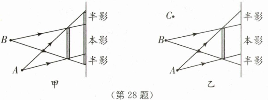 为了解释无影灯的工作原理,在课桌上点两支蜡烛分开放置于A、B两个位置,蜡烛前面立一本书,关掉日光灯可以看到墙壁出现书的本影和半影,如图甲所示.如果点燃三支甚至四支蜡烛,书的本影部分就会逐渐缩小,半影部分会出现很多明暗不同的层次.