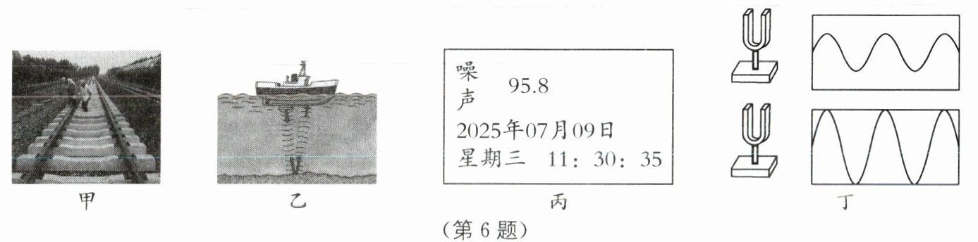 C [解析]图甲中,火车轨道下枕木下垫有大量的石子目的是使路基受到的压力更均匀,跟减弱噪声无关,A错误;图乙中,利用超声波探测海底深度,利用了超声波传播方向性好,在水中传播距离远等特性,B错误;图丙中,城市噪声监测仪,数字95.8后的单位是分贝,符号dB,C正确;图丁中,由上下两个音叉波形图可知,两音叉的振动频率相同,因此两音叉的音调相同,D错误.