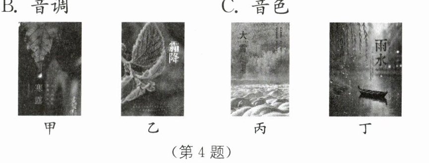 C [解析]声音的音色跟发声体的材料和结构有关,因此根据音色辨别是鼓还是镯发出的声音,C正确.