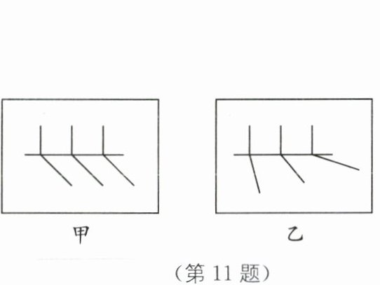 3×10⁸ 乙 直线 [解析]光在真空中的传播速度是目前人类发现的最快的速度,约为3×10⁸m/s.因为月光射向地面的光线近似平行光,所以影子也应是平行的,故甲是在月光下的影子图片,路灯发出的光是以路灯为圆心,向四周发散射出,所以竹竿的影子呈现为发散状,故乙是在路灯下的影子图片.由于影子是光射向不透明的竹竿被遮挡,在地上形成的黑影,故说明光在同种均匀介质中是沿直线传播的.