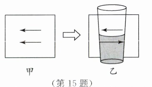 15. 如图甲所示,小明用一张画有两个同向黑色箭头的白纸,再将一只玻璃杯放置在白纸正前方,当向玻璃杯中注水至两箭头中间时,透过玻璃杯中的水看到有一个箭头反向且变长了.如图乙所示,则下列说法中正确的是(