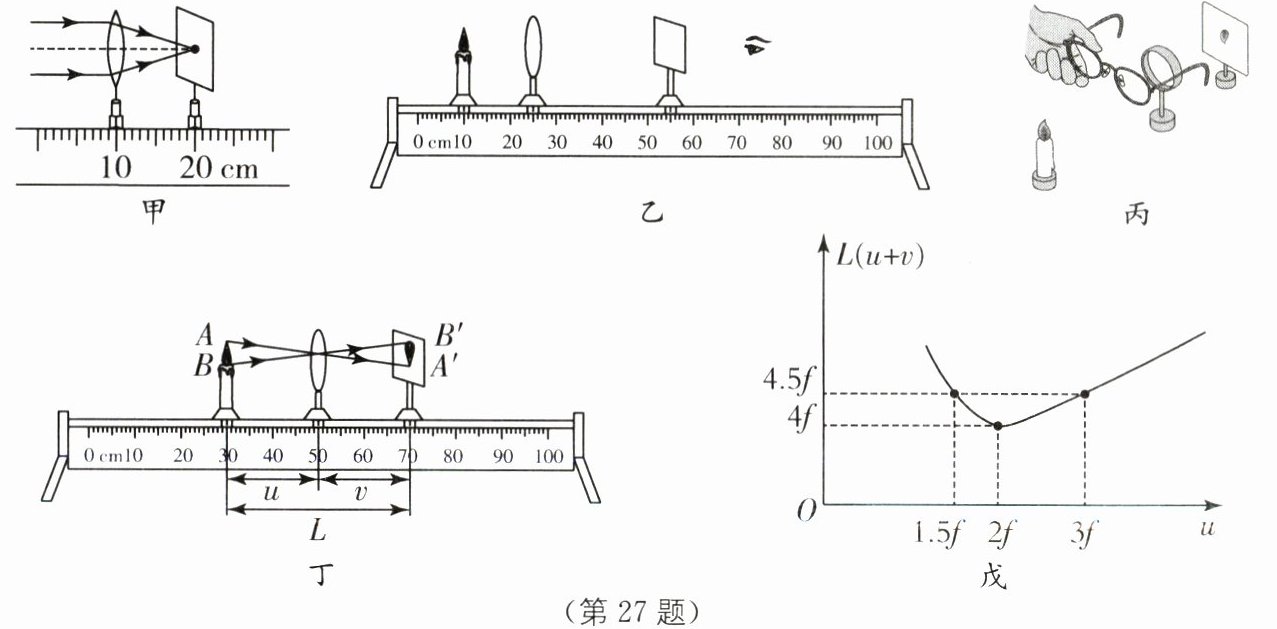 (用f表示).物理学中,有一个凸透镜成像的"新概念":放大率n= AB'/AB= v/u,结合丁、戊两图,可知当物距u= 2f时,n= 1