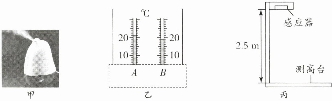 (5)超声波在生活中的应用十分广泛,图丙为一种超声波身高测量仪,其顶部的感应器竖直向下发射超声波信号,被感应器接收.某同学站上测高台,感应器记录信号从发射到接收所经历的时间为4×10^-3 s.已知感应器距测高台的高度为2.5 m,则该同学的身高为____________m.(空气中的声速取340 m/s)