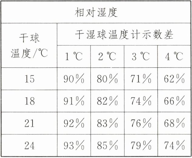 (2)水蒸发过程需要吸收热量,可知温度较低的B温度计是湿球温度计,温度较高的A是干球温度计;干球温度计示数为21℃,两温度计示数差为2℃,对照湿度表可知:此时空气中的相对湿度为83%.